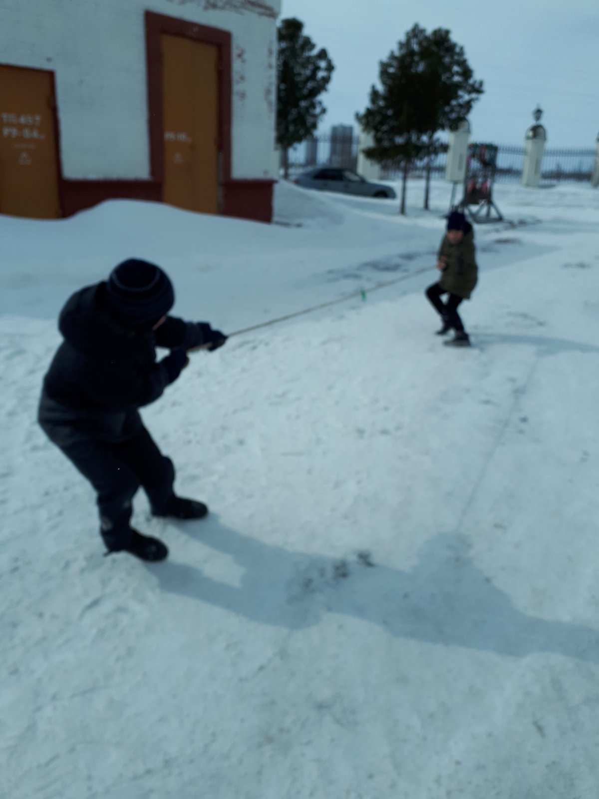 Два участника игры по команде ведущего начинают наматывать веревку на ручку. Кто первый смотает до фишки, тот и победитель.