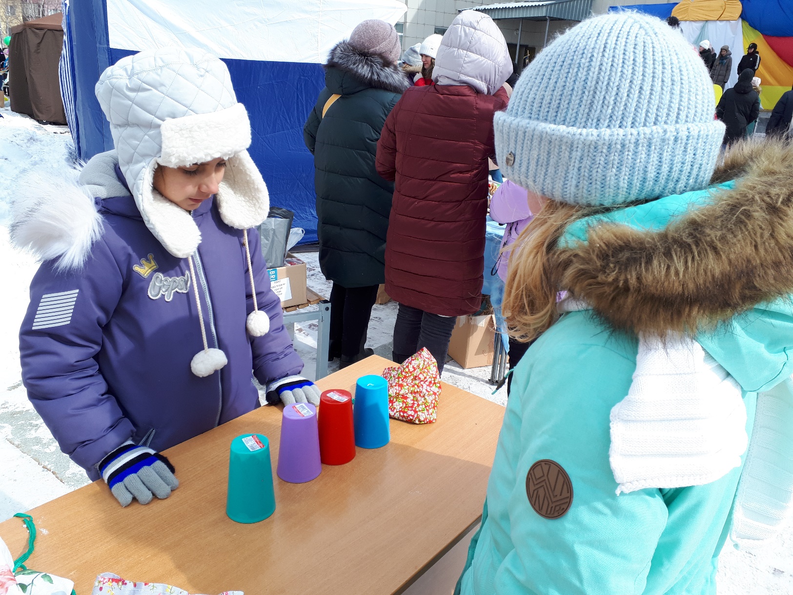 Оборудование: несколько пластиковых стаканчиков (чем больше, тем труднее отгадать), резиновое яйцо.