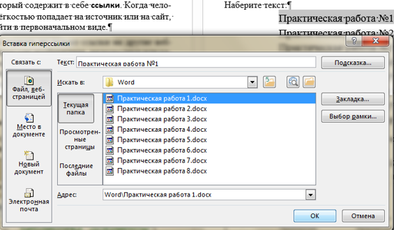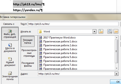 Выберите ВставкаГиперссылка. В появившемся окне в строке адрес вы видите адрес http://pk13.ru/lms/. Нажмите ОК.