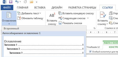 Выберите вкладку Ссылки Оглавление Автособираемое оглавление 1