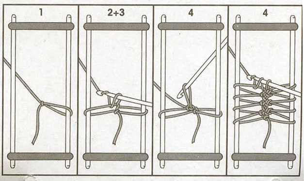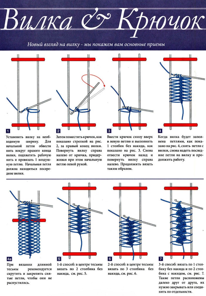 При вязании на вилке используется крючок. На вилке с помощью крючка вывязываются ажурные полосы, которые называют миньярдизами. Крючок, вилка и нитки должны соответствовать друг другу по толщине.