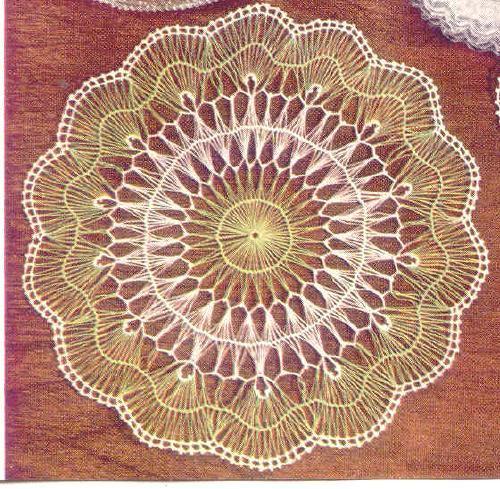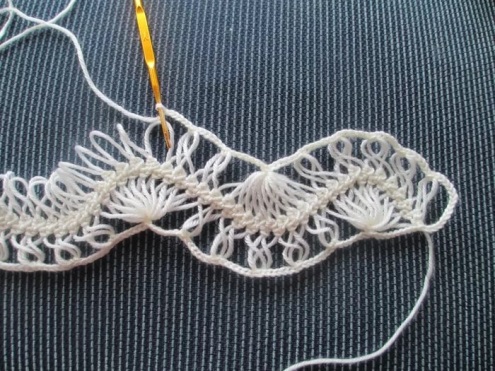 Следующий шаг, предусматривает образование второй петли. Для этого, удерживая дополнительный инструмент между спиц, повернуть их влево и вывязать от левой передней петли 1 столбик б/н. В такой последовательности нужно будет на вилке вывязывать петли до краев. После чего можно снимать готовую часть тесьмы. Для начинающих более просто будет осуществить такую процедуру, используя схемы с простыми вилками. Придерживая левой рукой полосу тесьмы, без лишних манипуляций, через верх можно без усилий снять крючком вывязанную часть.