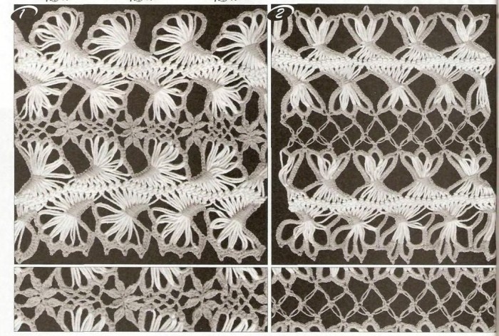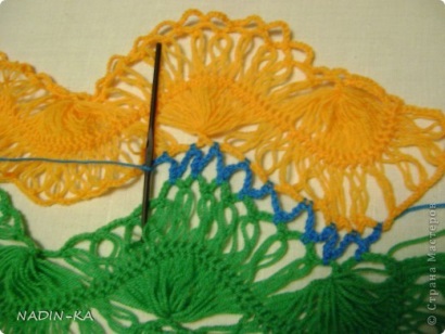 Вариантов соединения полос, связанных на вилке, много. Это соединение открытых петель полосы между собой, соединение прямых и волнистых лент с помощью обвязки крючком, а также соединение полосок с помощью мотивов.