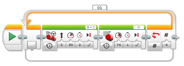Задание 3: изменить алгоритм (изменяя параметры движения вперед, НО! не изменяя угол поворота, и зациклив робота на конечное число повторений тела цикла - 4) и посмотреть какую фигуру будет рисовать робот. Пример:
