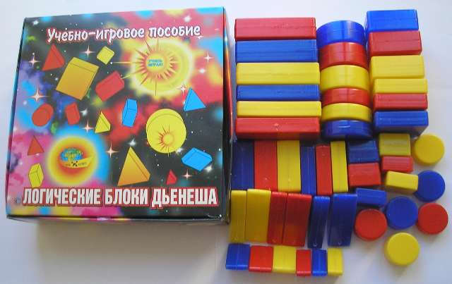 Золтан Дьенеш предлагает использовать для игр «логические блоки» (иногда их называют кубиками Дьенеша). Логические блоки Дьенеша - это набор из 48 геометрических фигур, причем в наборе нет ни одной одинаковой, все они различаются свойствами: формой (круглые, квадратные, треугольные, прямоугольные), цветом (красные, желтые, синие), размером (большие и маленькие) и толщиной (толстые и тонкие