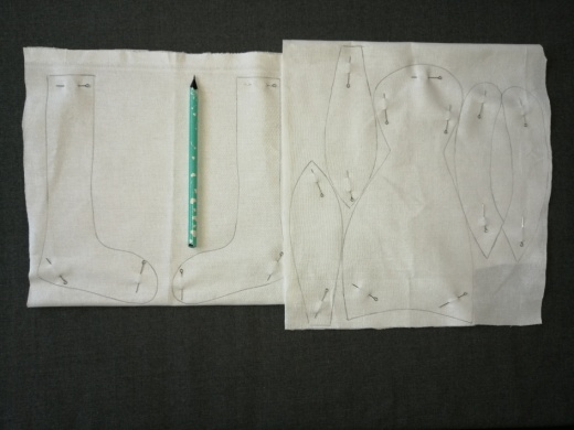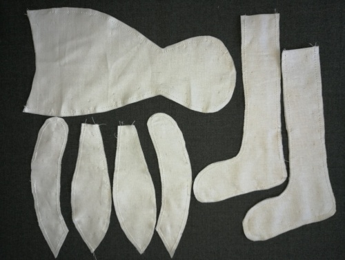 4) Прострачиваем на машинке на 0,5 см все сколотые детали, оставляя прорези для выворачивания (туловище-низ, руки - боковая часть, ноги – верх). |