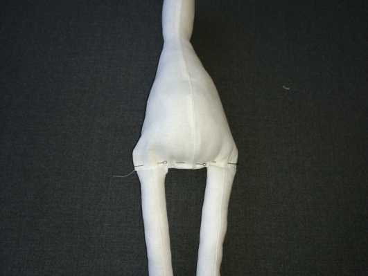 10) Разворачиваем тело игрушки и вставляем ноги игрушки, закрепляя низ туловища. Прошиваем на машинке. |