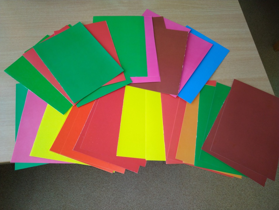 Нарезаем листы цветного двухстороннего картона пополам, что бы получилось 36 штук.