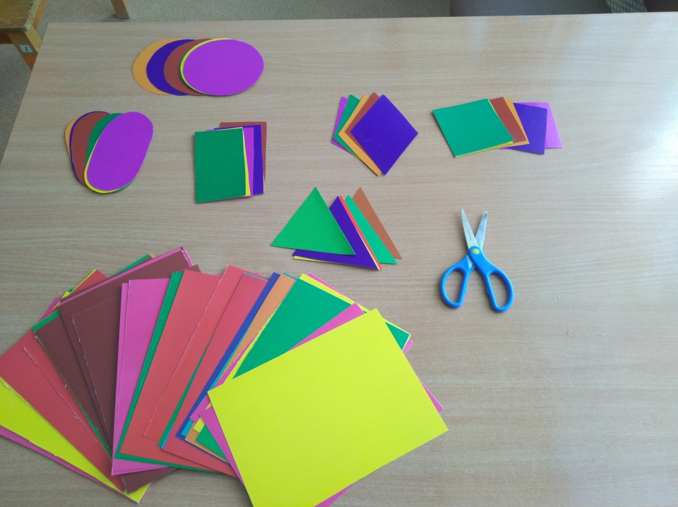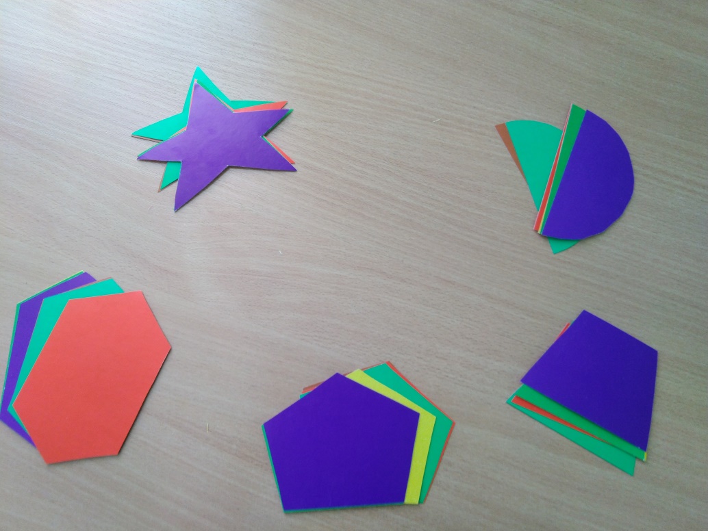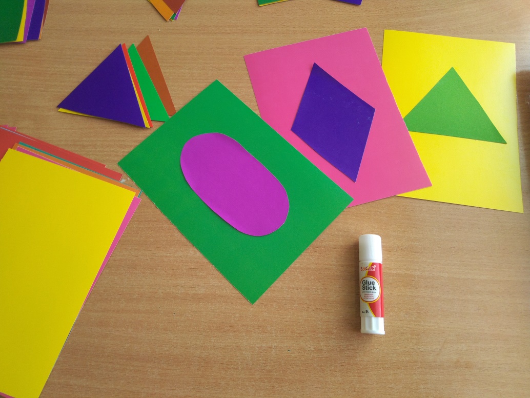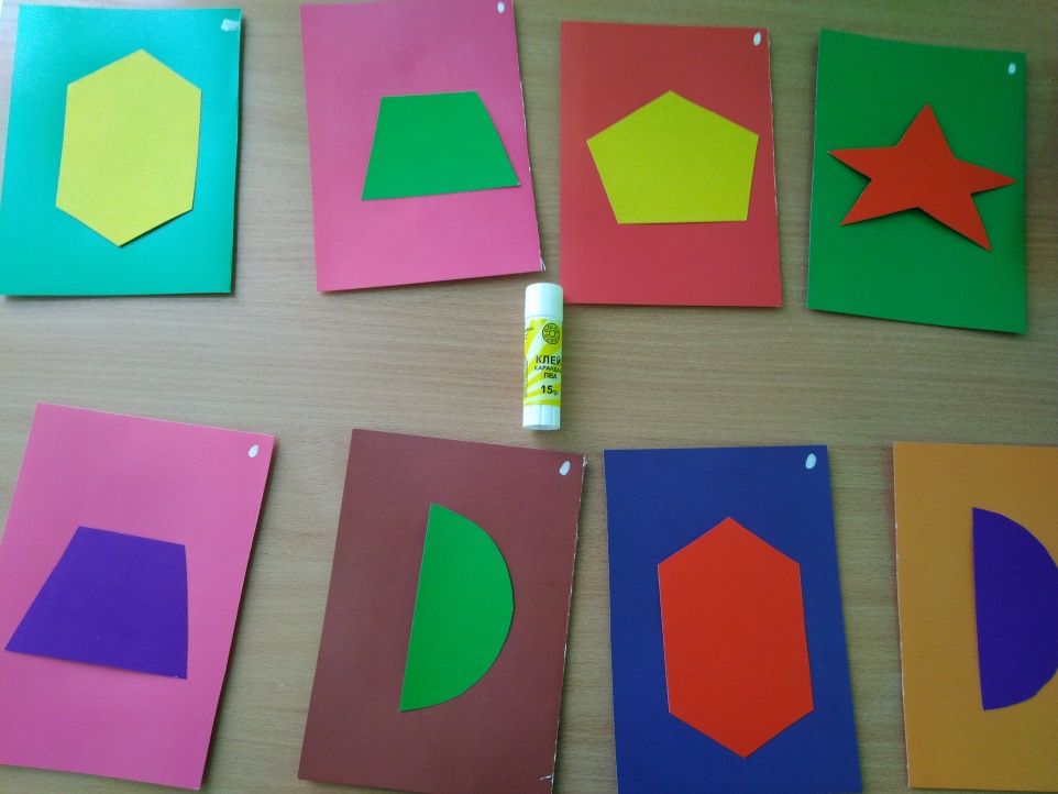 Приклеиваем вырезанные геометрические фигуры на листы цветного картона, чтобы цвета не совпадали.