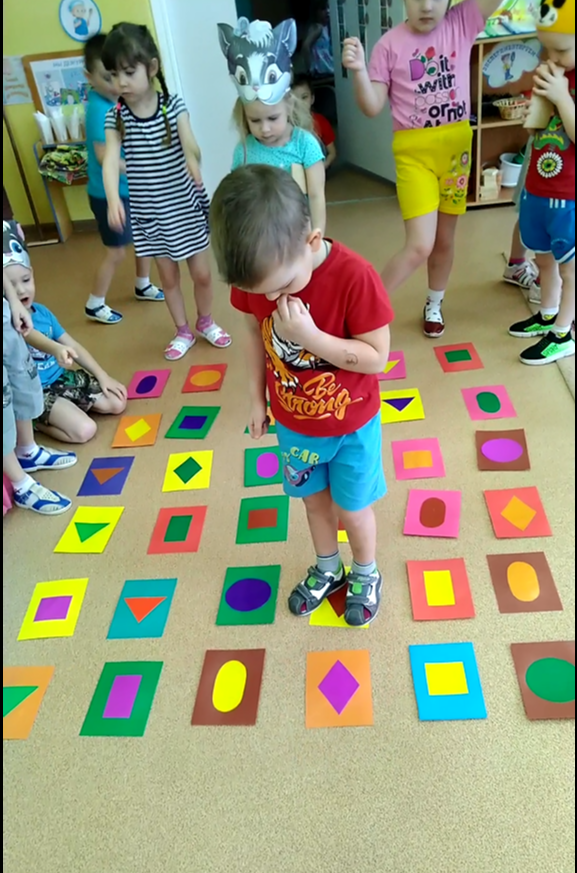 Ведущий раскладывает карточки на полу по 6 штук в 6 рядов, что бы в каждом ряду были разные геометрические фигуры. Затем выбирается 1 игрок. Он должен пройти от начала до конца по карточкам только с определенной геометрической фигурой, например, только по треугольникам. Ведущий внимательно смотрит, что бы игрок правильно шел по карточкам. После прохождения игры 1 игроком выбирают следующего, и называют ему другую геометрическую фигуру для прохождения.