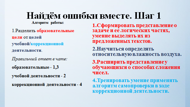 Предлагаем участникам, используя алгоритмы предложенный ранее, найти ошибки в формулировках. Проверяем пошагово согласно алгоритму.