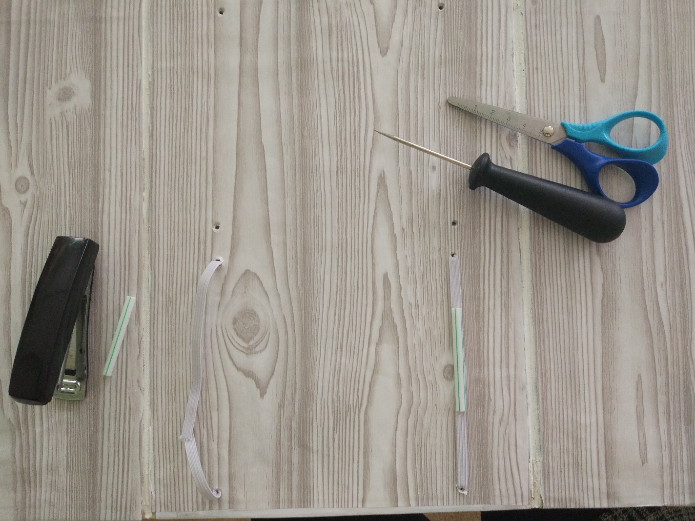Для того, чтобы было удобно доставать конверты с разрезными картинками, их вставляем в рамки из бельевой резинки. Для этого прокололи шилом отверстия в ширме, протянули с помощью иглы с большим ушком резинку через отверстия, продели на резинку кусок от коктейльной трубочки, скрепили концы резинки степплером и закрыли место скрепления трубочкой. Таким образом мы прикрепили по два конверта с каждой стороны.