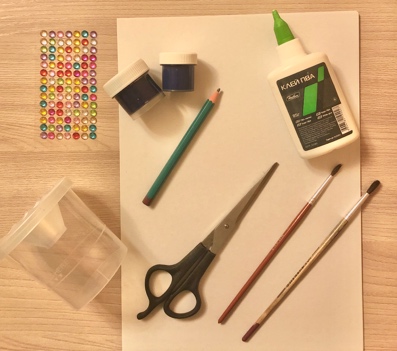 | Картон, ножницы, карандаш, гуашь, кисти, стразы, клей ПВА, баночка для воды. |
