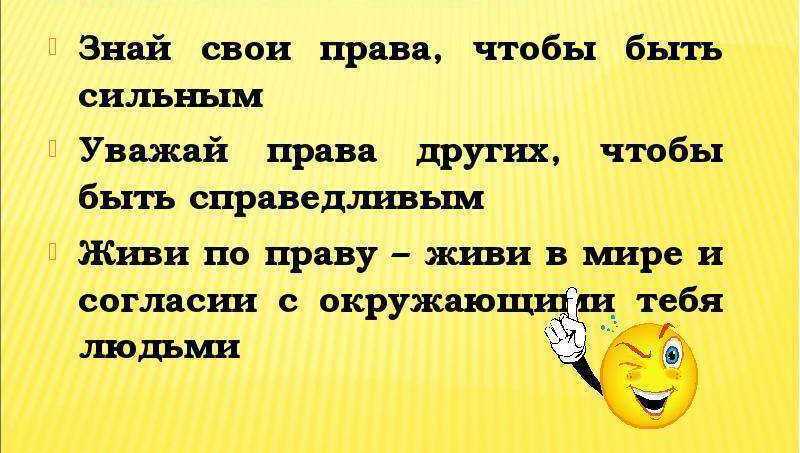 Основная цель правового (юридического) воспитания – подготовить ребенка к самостоятельной жизни в обществе, то есть к тому, чтобы он был доволен своей жизнью, самостоятельно себя обеспечивал и не приносил проблем окружающим людям, знал свои права и обязанности.