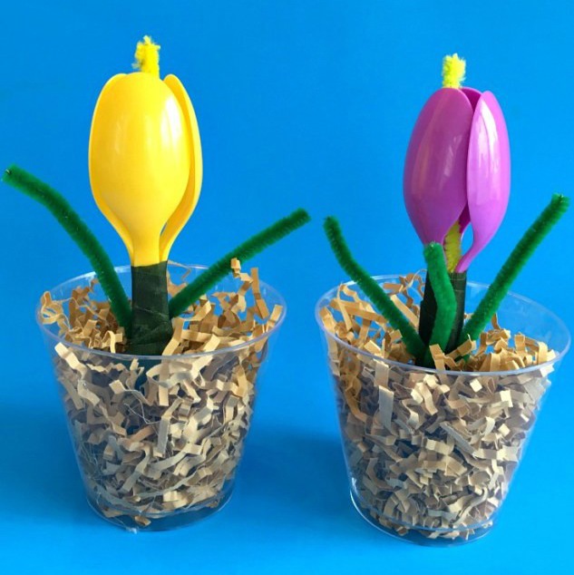 Для создания такого цветка нам понадобится: 3 пластиковых ложки, пластиковый стаканчик, изолента, цветная бумага, гуашь, клей, пластилин.