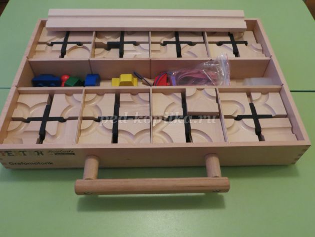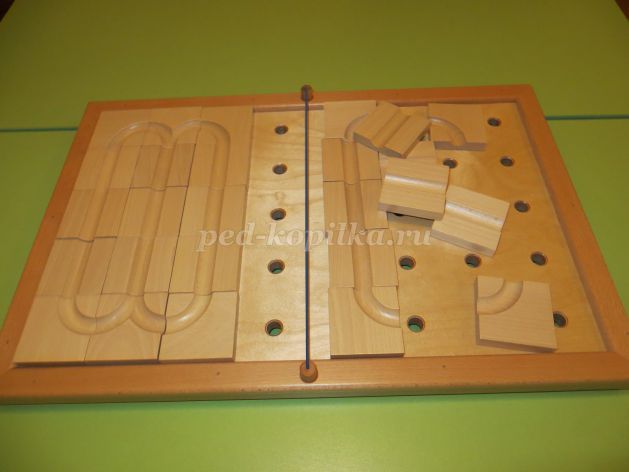 Построить извилистую дорожку, накрыть оргстеклом. При помощи магнитного штифта ребенок должен провести стальной шарик по дорожке.