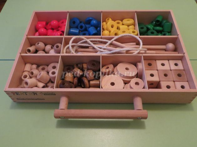 Цель: Удерживание деталей пальцами и надевание колец разной формы на шнур.