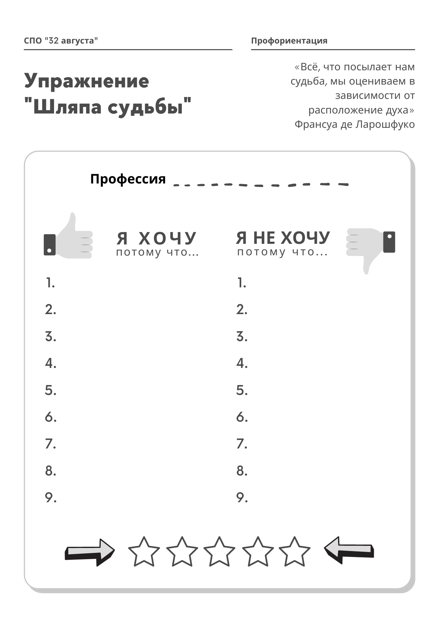Ведущий 1: Сейчас каждый участник получит схему анализа профессий (см. приложение №8). Ваша задача – заполнить её в течение 3 минут, а после подумать, почему вы хотели или не хотели бы работать по профессии, которая выпала.