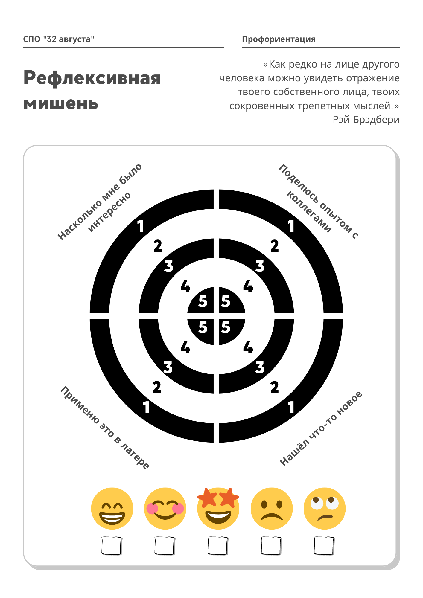 Ведущий 1: Эта техника используется для рефлексии самых разных сторон состоявшегося дела или мероприятия. Преимущество этого приёма в том, что он очень гибок, его легко подстроить под свои цели. Также он позволяет оперативно получить отклик участников сразу по нескольким аспектам занятия, и это очень легко провести в лагере.