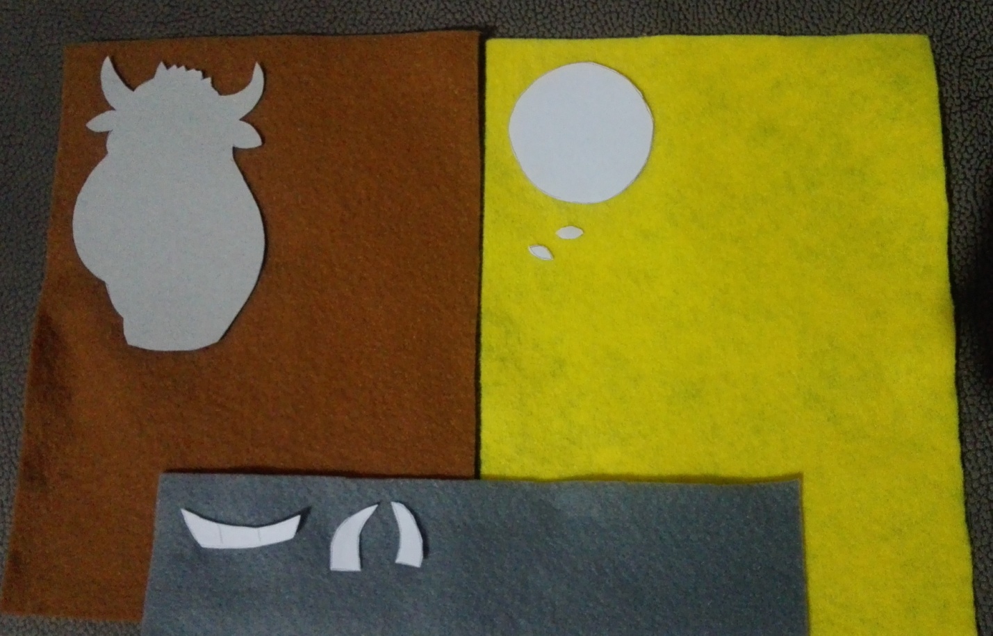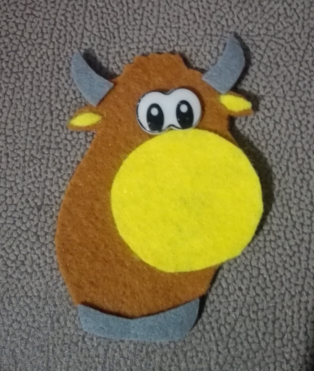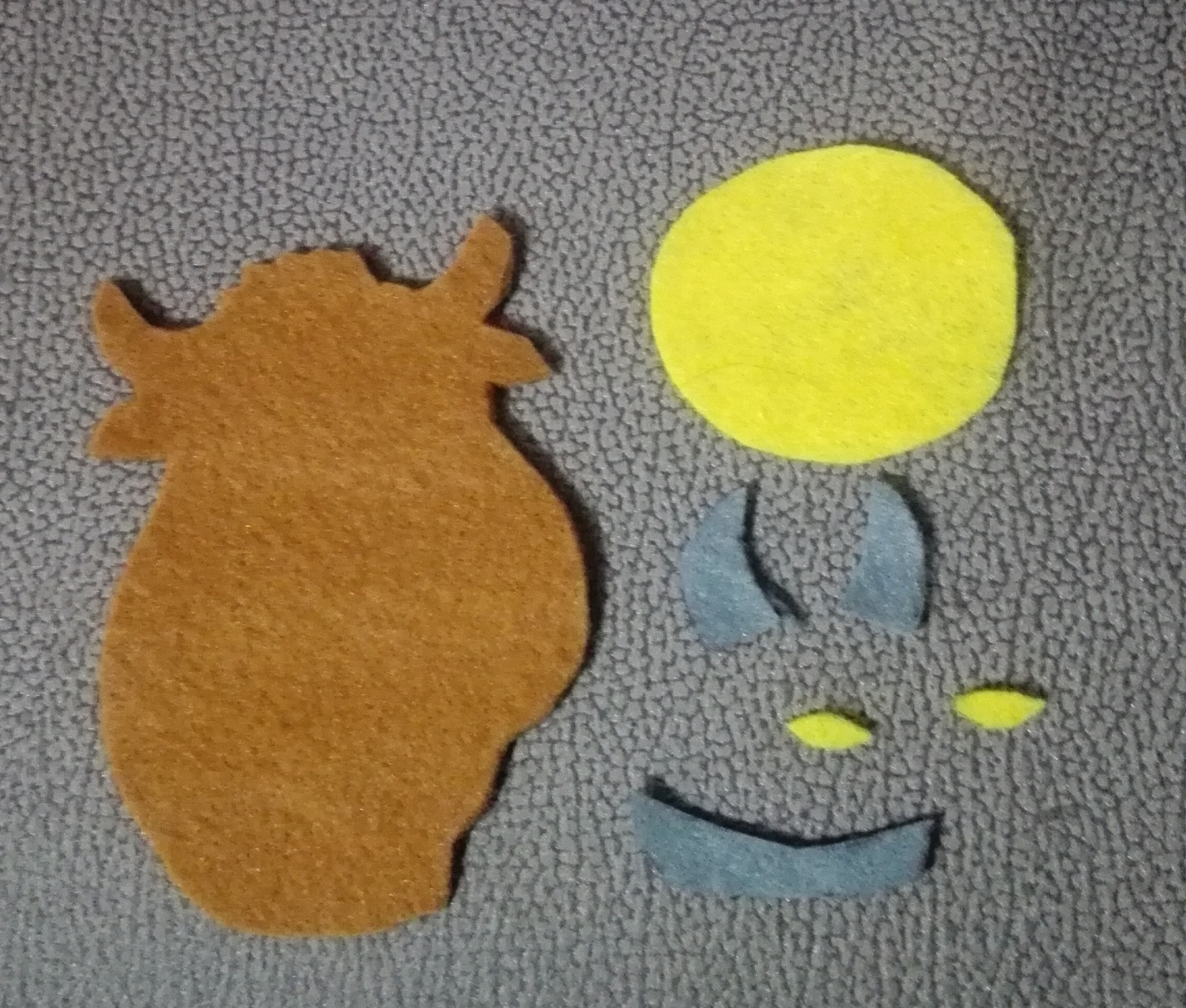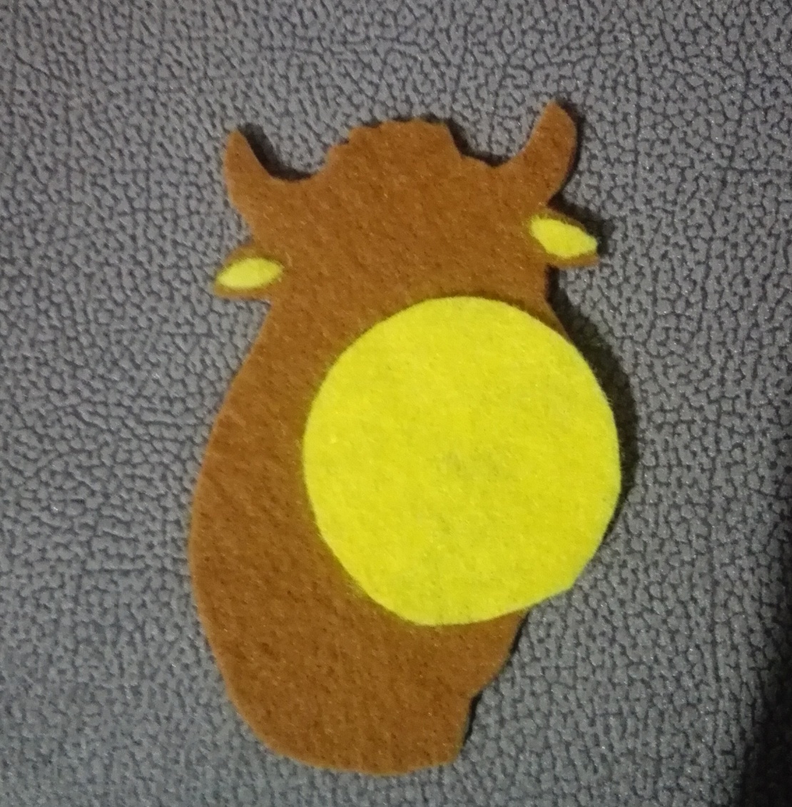 6. На картонную основу наклеиваем туловище (деталь из коричневого фетра), мордочку, рога, вставки в ушки, копыта, приклеиваем глазки.