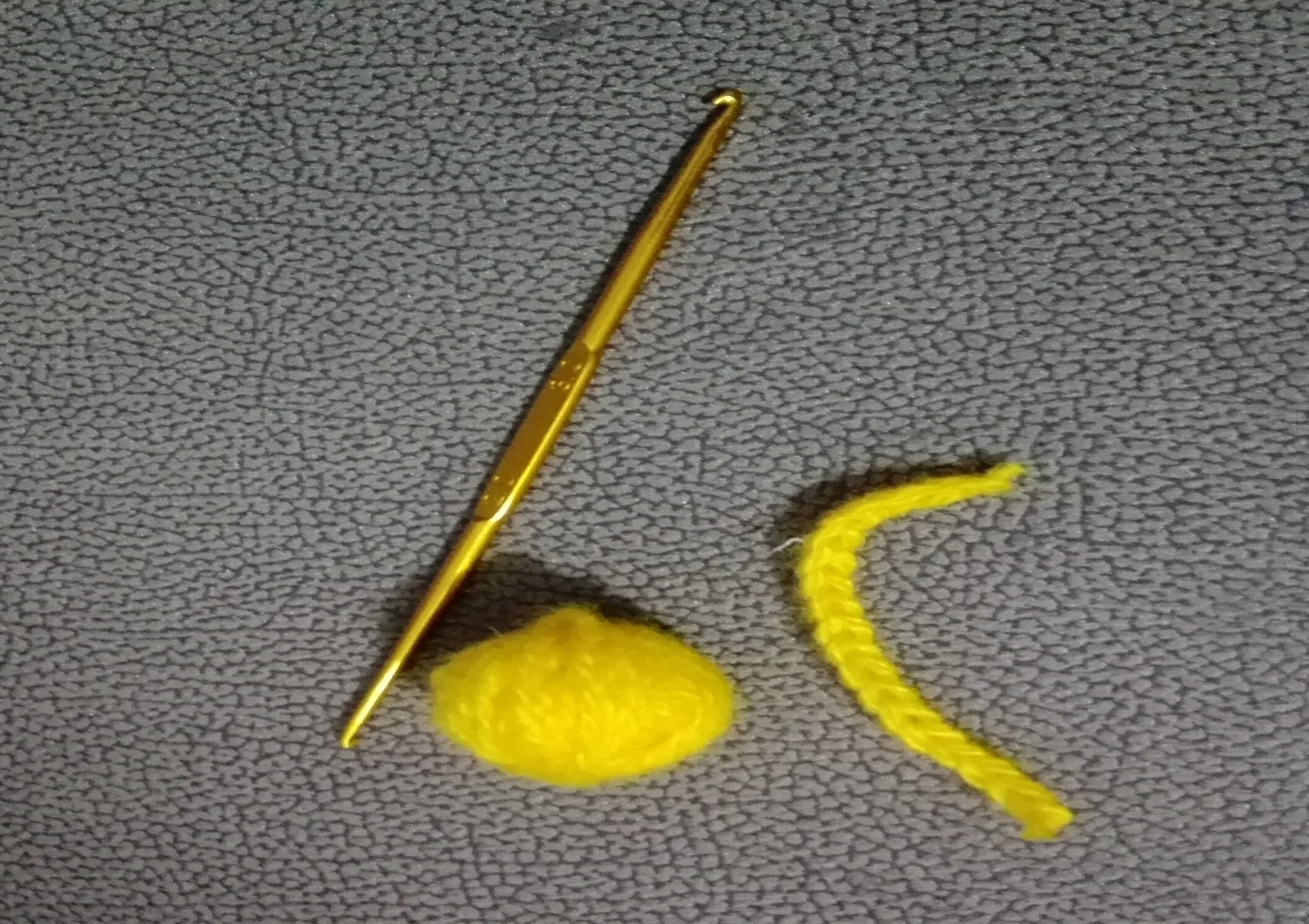 7.Из жёлтой пряжи вяжем цепочку из воздушных петель 5-6 см.