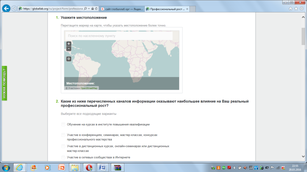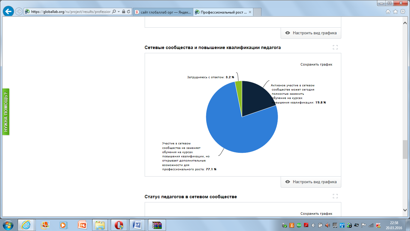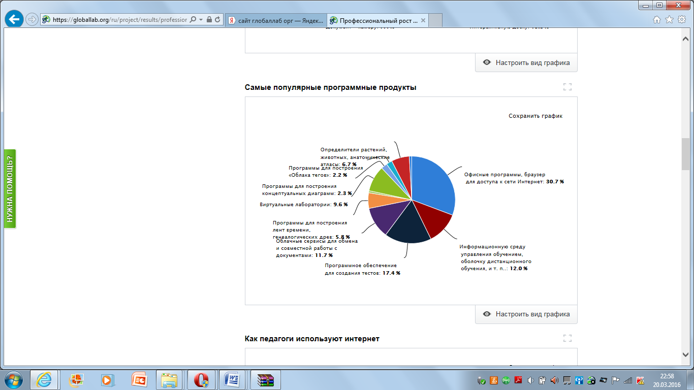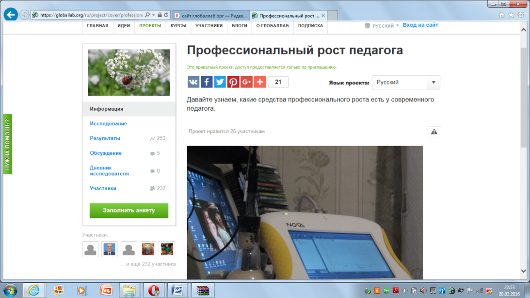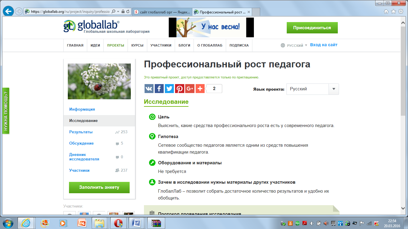 Оборудование: ноутбуки с выходом в Интернет, работа на площадке ГлобалЛаб https://globallab.org/ru/project/cover/professionalnyi_rost_pedagoga.ru.html#.Vu7VBWdf2P8