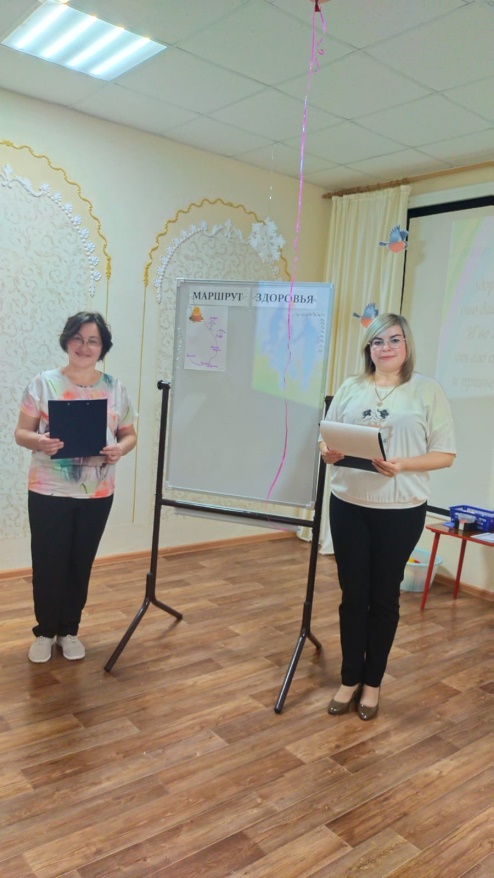 Вед 1:Обратите внимание, уважаемые коллеги, что мы вам продемонстрировали маршрут, на котором не все моменты отражены. Посмотрите внимательно и подумайте, что бы вы ещё добавили? У вас есть возможность составить свой маршрут здоровья, такой, который могут использовать и ваши дети, и вы, и воспитанники вашей группы.