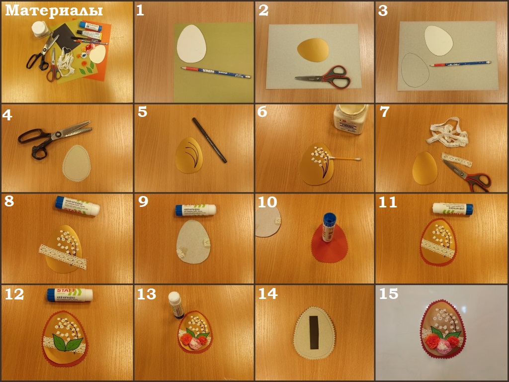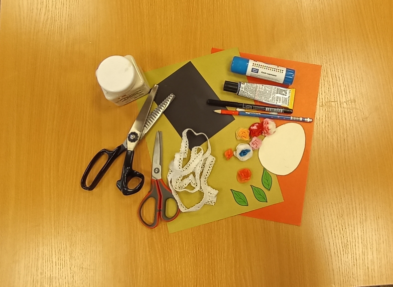 Для обучающихся: пошаговая инструкция выполнения работы, ножницы, фигурные ножницы, простой карандаш, шаблон «яйцо», старый магнит на холодильник, красный и золотистый картон, кружево, цветы из бумажных салфеток, листочки из зеленой бумаги, белая гуашь, черный маркер, клей-карандаш, клей «Момент», ватная палочка.