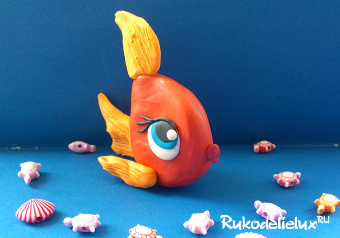 Наша рыбка - оранжевая с желтыми плавниками, она маленькая и яркая, у нее бездонные глазки. Такую копию несложно сделать своими руками, Почему мы выбрали именно рыбку? Это необычный вариант, к тому же легкий в исполнении.