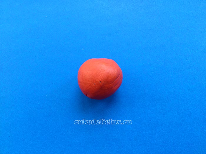 1. Нашу рыбку мы слепим из оранжевых брусочков двух разных оттенков. Для игрушечной миниатюры рыбки также подойдет голубой и синий, розовый и красный, сиреневый и фиолетовый цвета. Из оранжевого пластилина темного оттенка скатайте шарик.