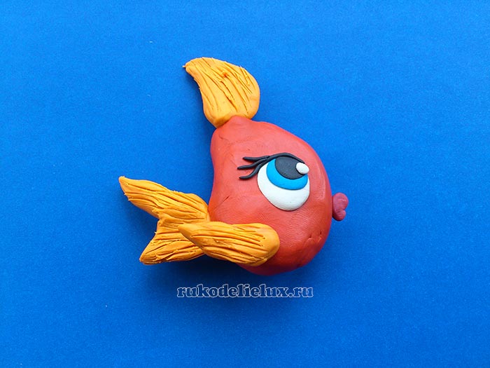 5. Добавьте черные точки. Обрамите обязательно кокетливыми ресницами — наша рыбка должна быть красавицей. Маленькие плавнички прикрепите по бокам с двух сторон симметрично. Также впереди приклейте аккуратный рыбий ротик. Помните, что глазки нужно сделать с двух сторон.