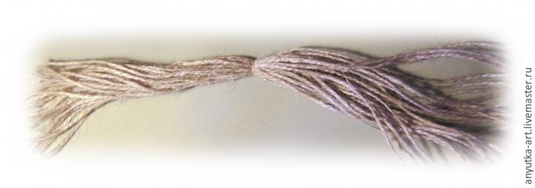 11. Готовим пучок шпагата для задних ног коника. Количество ниток в нем, должно быть такое же, как и в первом большом пучке из которого формировали голову, шею и передние ноги коника. В моем случае, это 28 ниток. Перевязываем пучок посередине.