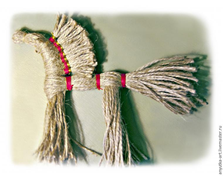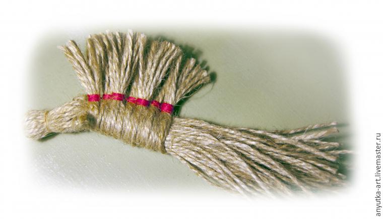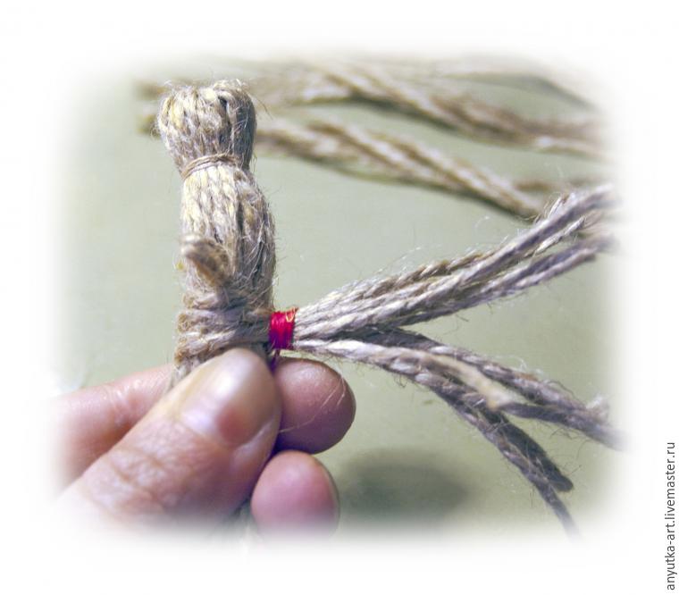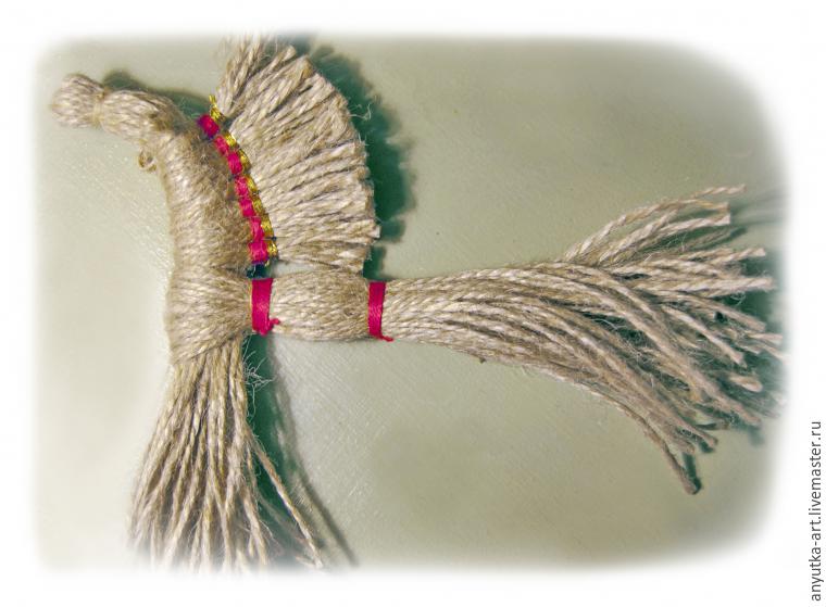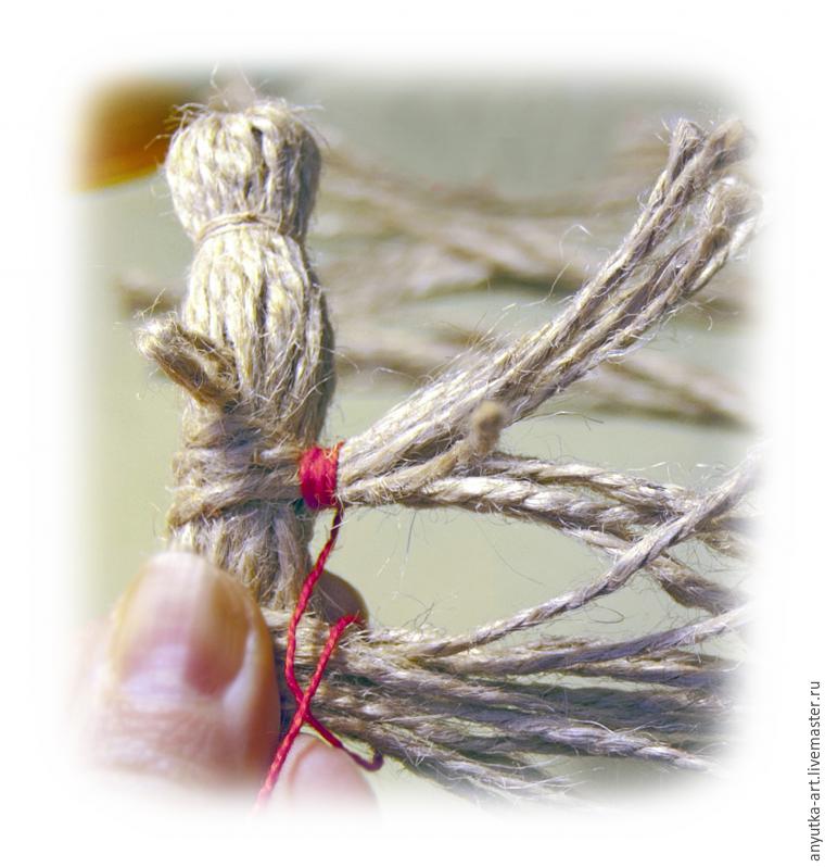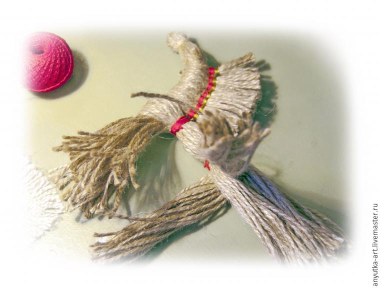 10. Берем отложенный длинный пучок шпагата и обхватываем первый пучок ниже гривы. Обматываем нитью красного цвета. Отступя немного дальше, также обматываем, обозначая среднюю часть тела.