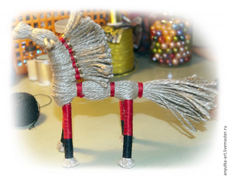 13. Делим оставшуюся часть самого первого пучка пополам и обматываем каждую половинку нитками, стараясь класть виток к витку, без перехлестов. Получились передние ноги коня. Также обматываем задние ноги. Подравниваем ноги, гриву и хвост.