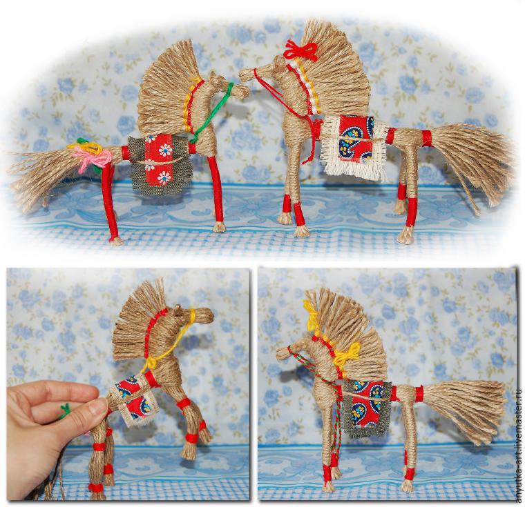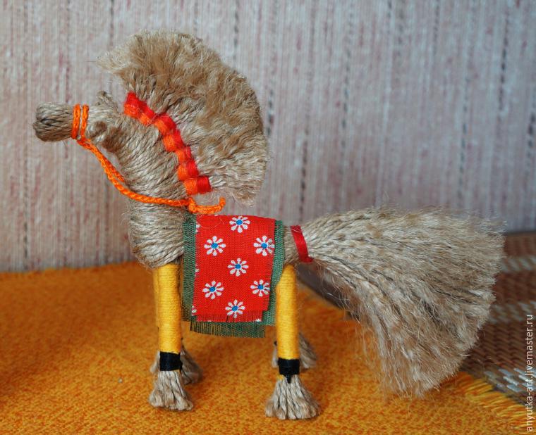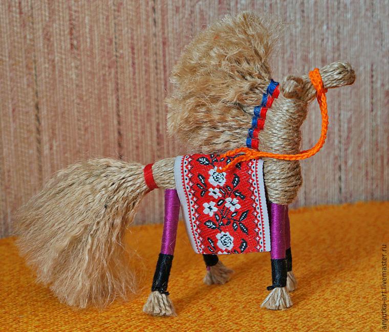 Конь или коник, один из самых древних и традиционных оберегов славян. Образ коня связан с солнцем. Приносит в дом удачу, достаток, свет и тепло. Конь - это символ силы и верности. Традиционно, солнечный конь считается мужским оберегом.Подарите этот оберег любимому мужчине, и верный Конь будет хранить и оберегать его, поможет преодолеть все трудности, выведет на верный путь. Как и все куклы-обереги, делается без глаз, во избежание проникновения в куклу злых духов. И без применения иглы, так как обереговую куклу нельзя колоть.