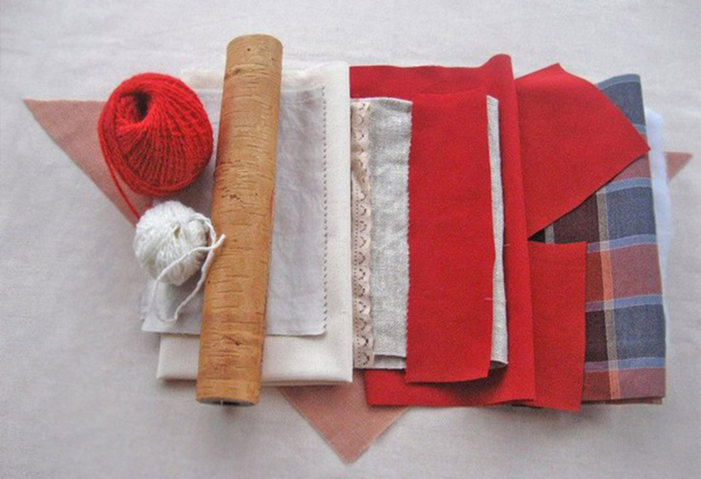 Для начала подготовим материалы. Поищите в лесу упавшие березовые ветки и срежьте с них лубок 10х30 см. Подберите ткани, а также ленты и нити в тон. Ленты можно взять красными – этот цвет очень хорошо подходит для оберегов, а у славян он вообще считался сакральным. Не забудьте и про наполнитель – он должен быть натуральным. Это могут быть травы или клубок шерстяных ниток.