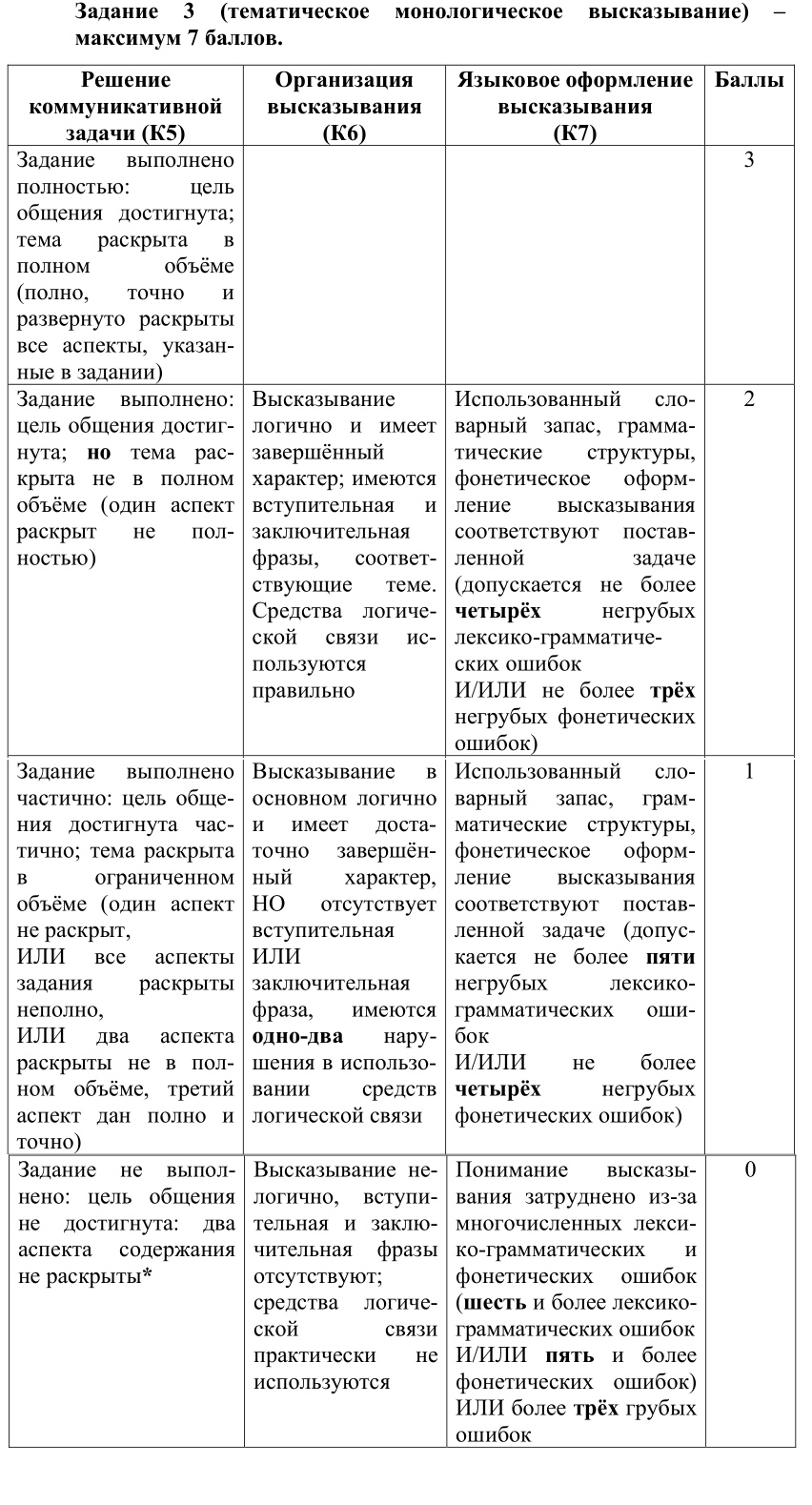 3. | Тематическое монологическое высказывание | 1,5 мин. | 2 мин. | 7 баллов |