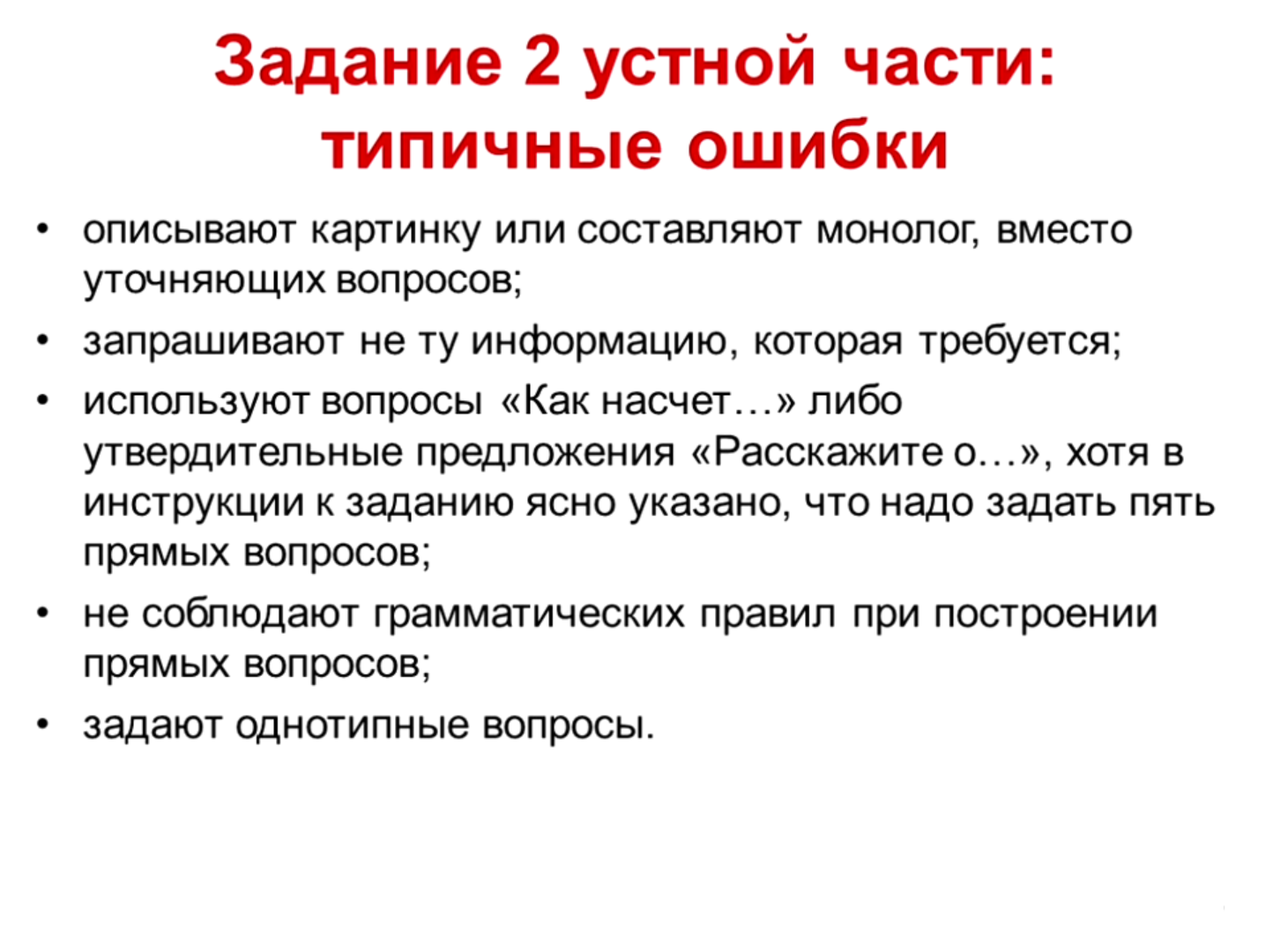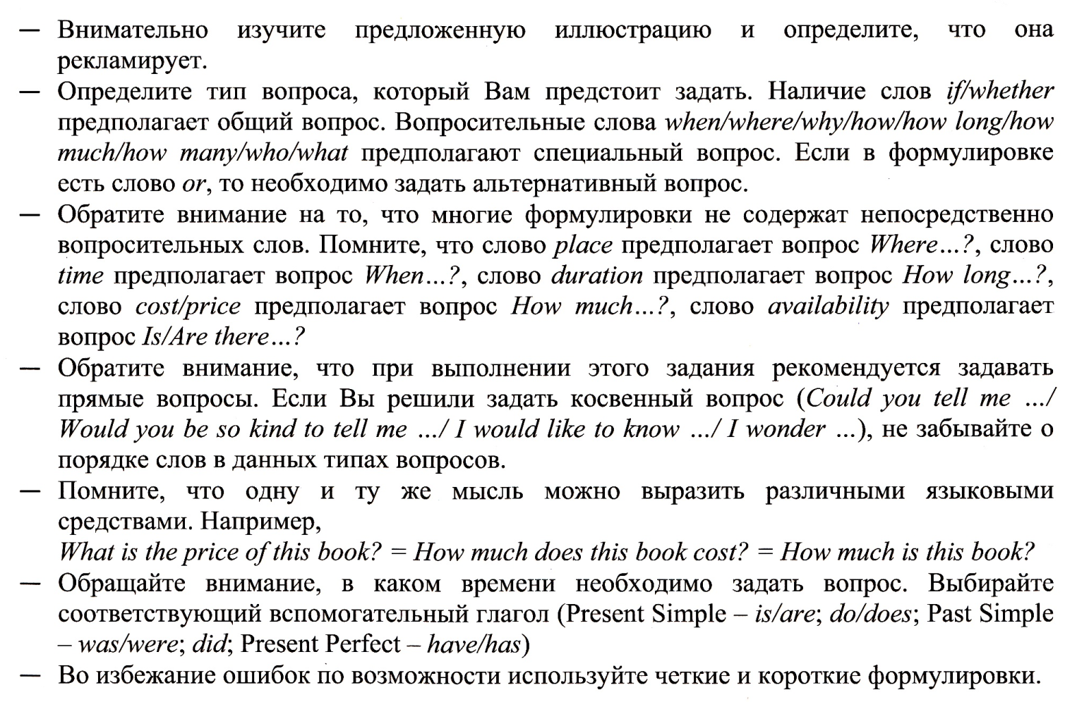 2. | Формулирование вопросов (условный диалог-расспрос) | 1,5 мин. | 20 секунд на каждый вопрос | 5 баллов (1 балл за ответ) |