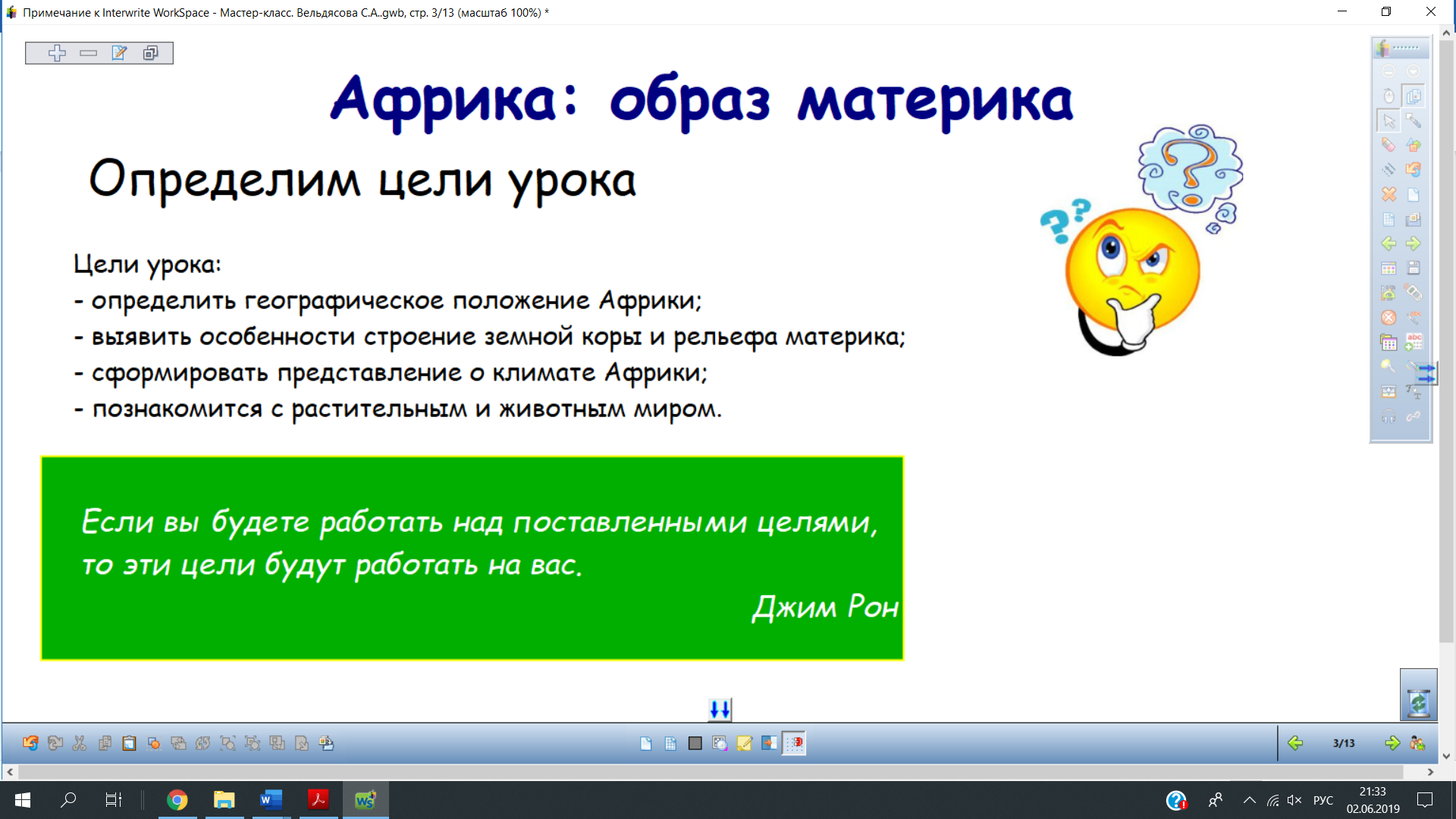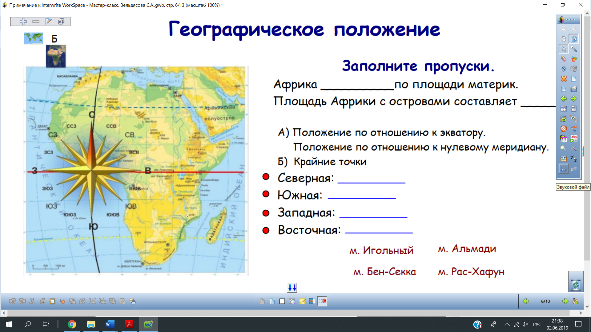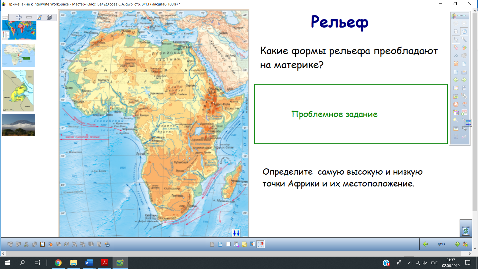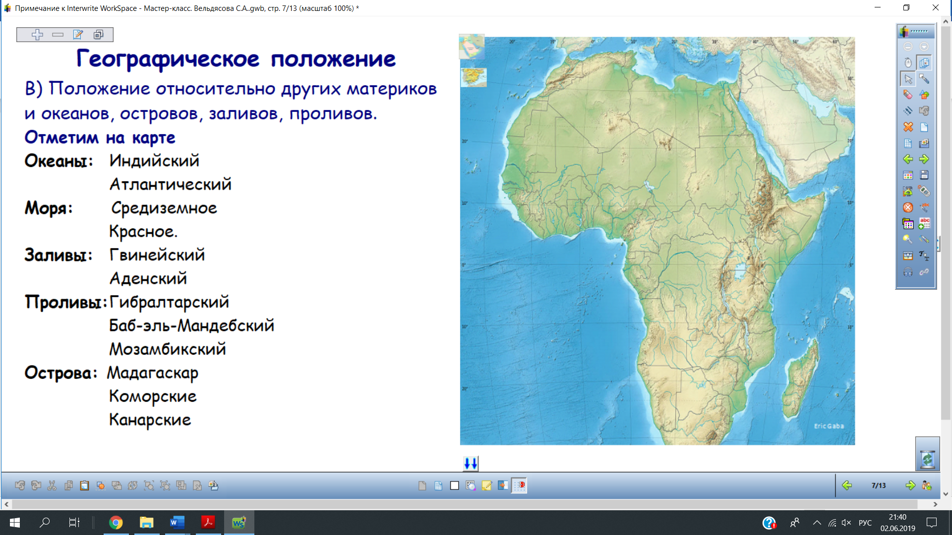 Далее используя различные способы и приемы интерактивной доски изучается материк «Африка». Работая на интерактивной доске, можно выбрать маркер и сделать запись, добавить комментарий, нарисовать круг, подчеркнуть или выделить нужную информацию.