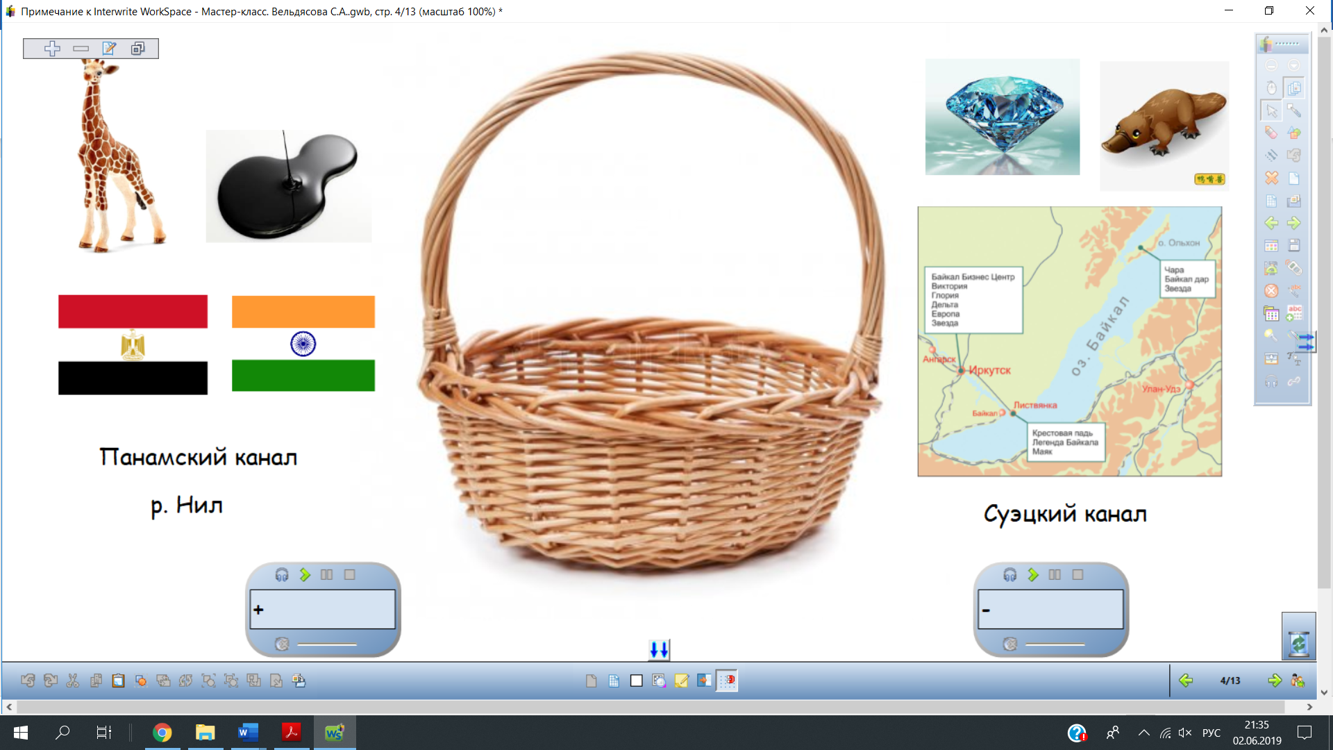 Далее на следующим этапе актуализируем знания с помощью приема «Корзина идей», на экране представлены различные объекты необходимо выбрать те, что имеют связь с материком Африка, и передвинуть их в корзину.