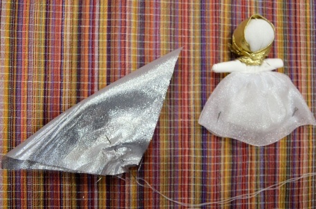 Делаем крылышки, складываем кусочек ткани по диагонали (косынкой), посередине прокладываем наметочный шов, сосбариваем.