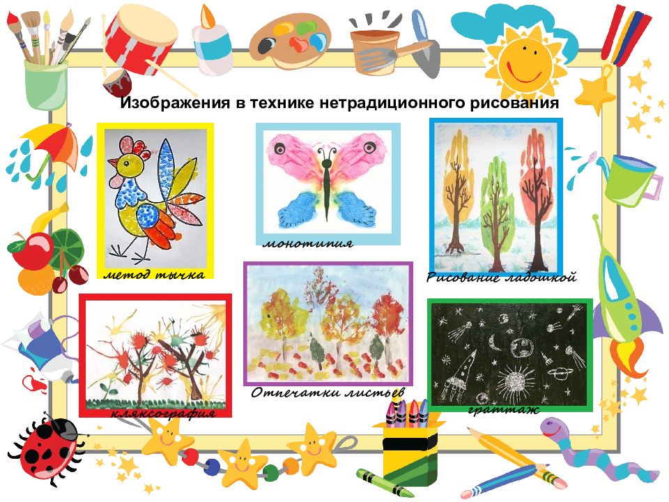 Воспитатель: Рисование и занятие творчеством – одно из самых любимых занятий детей и взрослых. И я этому не исключение. Сегодня педагоги и родители проявляют истинную изобретательность в выборе и придумывании различных оригинальных способов творчества. Здесь главные критерии – новизна, увлекательность, удовольствие от процесса и интересный результат.