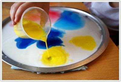 Наливаем кефир в тарелку. Капаем ложечкой несколько капель краски в кефир или наливаем по чуть-чуть из стаканчика.