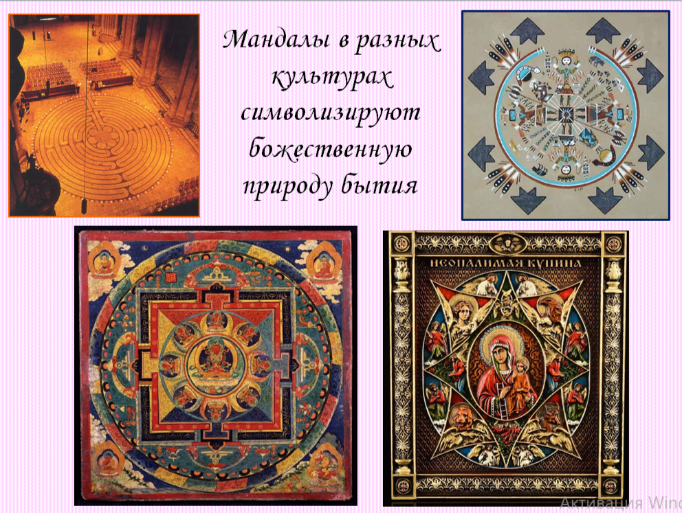 Мандала – это круг, в который вписаны различные символы. Наибольшее распространение мандалы получили в практиках индуизма и буддизма, где по сей день используются для медитаций и духовного развития. Смысл произведений на слайде совершенно разный, однако сходство в том, что присутствует некая геометрия, в центре которого располагается божество. Это модель вселенной.