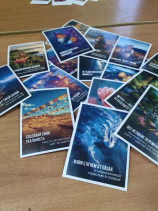 Каждому участнику выдаётся мотивационная открытка с каким-то изображением и надписью. Если трудно отобразить в мандале своё актуальное состояние, то можно передать «атмосферу», «вайб» открытки. В процессе работы играет классическая музыка, участники могут пить чай. |