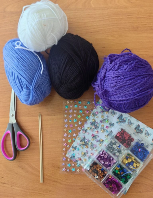 | Выбрать: 1. деревянные палочки 15 см; 2. пряжу разных цветов; 3. ножницы; 4. клей; 5. различный декор: цветные наклейки, бусины, пайетки, бумага с изображениями. |