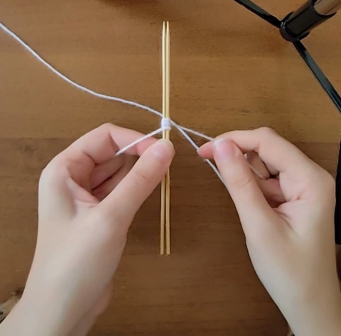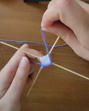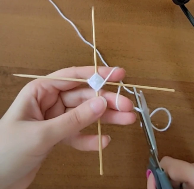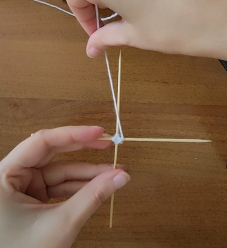 | Соединить палочки в центре с помощью узелка. Затем обернуть палочки нитью несколько раз. |