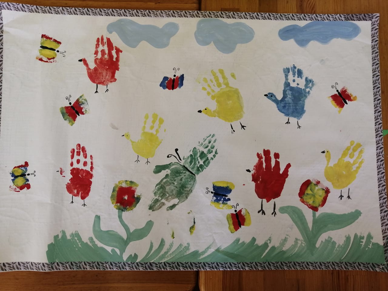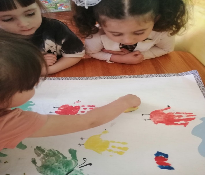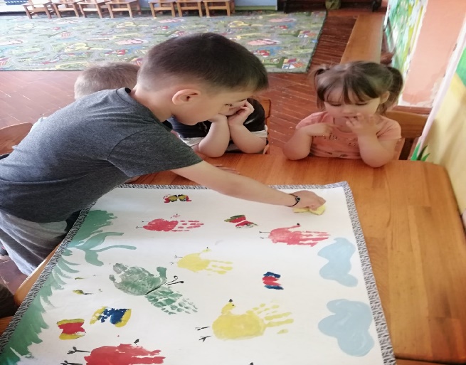 Воспитатель показывает детям и бабочке поляну с цветами и птичками нарисованных ладонями ,подготовленную детьми на прошлом занятии.