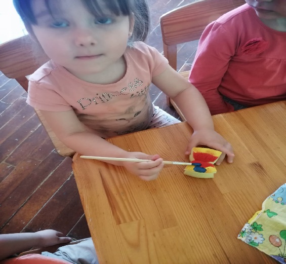Раздаточный материал: губки для посуды в форме бабочки, стаканчики-непроливайки, гуашь красная и желтая,зеленая,синяя (в баночках), кисть с мягким ворсом №10 на подставке, подставка для кисти, салфетка.