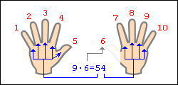 Но умножение на 9 на пальцах – это нечто особенное. На фото выше продемонстрировано умножение 9 на 7. Загибаем 6 палец и сразу же видим ответ: первая цифра - количество пальцев слева от загнутого, вторая - справа. Итого 54!